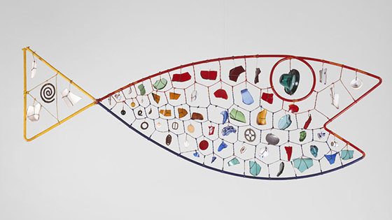 Nagy, who over the decades developed what she refers to as a “lexicon of Calder knots,” immediately spotted the imposters. In “Fish” (below), 1944, bits of colored glass, beads and mirrors now shimmer like fish scales in the slightest wind. Nagy reworked the strings—some of which had been replaced, others that were original but likely to break. In the aging originals, Calder’s engineering skills were evident: “He was very particular about the thickness of the string,” recognizing that it would impact the way the mobile worked.