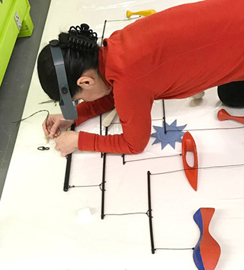 Now, sixteen suspended mobiles, plus eight motorized mobiles, spin, whir and, in some cases, collide and gong to Calder’s plans, thanks in large part to the efforts of research conservator Eleonora Nagy (at right, repairing the Calder mobile “Seascape”). Trained museum technicians “activate” the mobiles three times on weekdays and six times on the weekends, giving visitors a chance to watch the mobiles and their unpredictable dances, eight floors above the city. To make certain the technicians moved the mobiles correctly, videos were made: “A document from the horse’s mouth,” says Nagy.