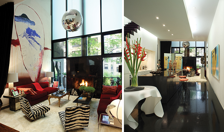 Top: Architect Robert Couturier designed a “1880s version of Louis XVI house” for clients in Brooklyn. Photograph by John M. Hall. For his own home and office architect William T. Georgis opened the living room to the garden with a glass curtain wall; portraits of the architect, painted by Alex Katz, greet guests. Photograph by T. Whitney Cox, courtesy of Georgis & Mirgorodsky.