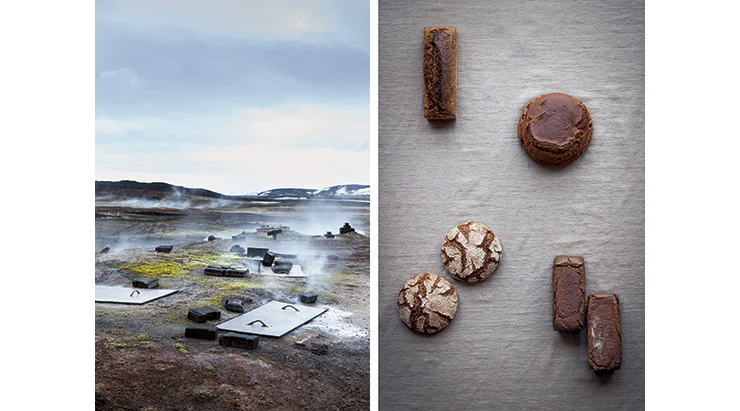 Above left: From The Nordic Baking Book. Thermally active area, south of Lake Mývatn, Iceland, May 2013; the site is considered a communal area and each family in the neighboring village has their own hole in the ground in which they bake Icelandic Rye Bread. Right: Breads based on rye flour, clockwise from top left: Danish Rye Bread; Icelandic Rye Bread; Scanian Rye Bread; Finnish Rye Bread. All photography by Magnus Nilsson.