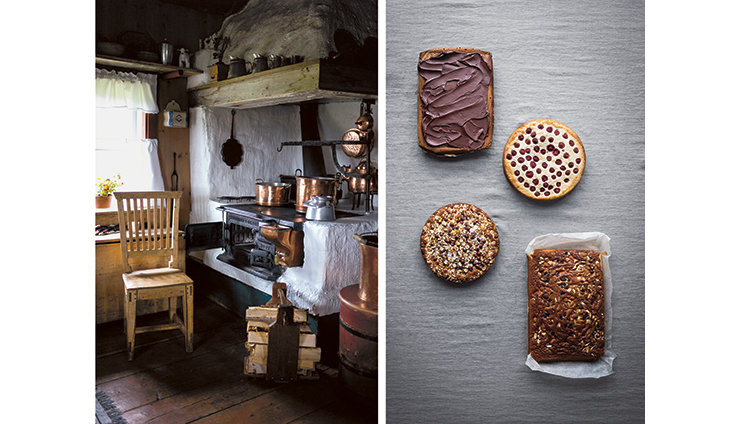 Above left: Interior of a traditional north Swedish mountain farm house, summer 2014. Right: Soft cakes, clockwise from top left: Danish Spiced Honey Cake; Semolina Sponge Cake; Mother Monsen’s Cake; Apple Cake with Nuts and Pearl Sugar. All photography by Magnus Nilsson.
